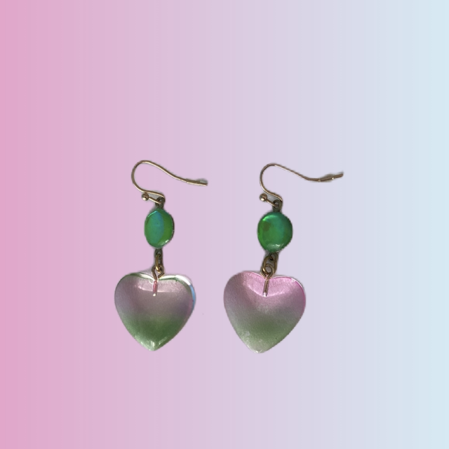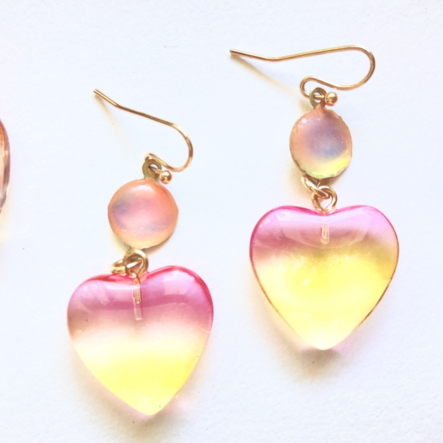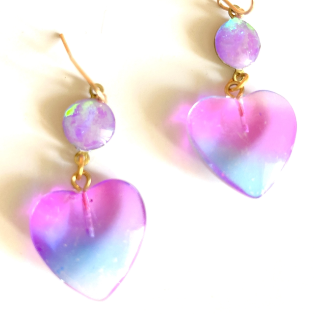Ravissantes boucles aux jolies teintes : pendentif en coeur de verre transparent teinté en dégradé et