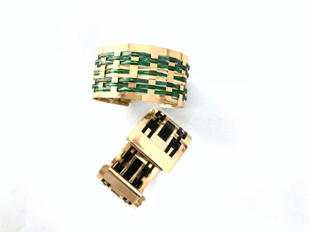 ◆ Ce bracelet de manchette en laiton doré plaqué or 5 microns de grande qualité est décoré d'un tissage de fils de vinyle doré champagne et de fils noir brillants ou vert paillettes. Ce bracelet chic et original ponctuera votre tenue avec une touche graphique.